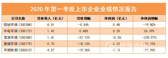 目前國(guó)禎環(huán)保、中電環(huán)保、雪浪環(huán)境、惠城環(huán)保和華測(cè)檢測(cè)已經(jīng)發(fā)布2020年第一季度的報(bào)告,具體營(yíng)收情況如下: