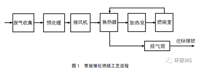 根據(jù)對(duì)廢氣加熱方式的不同,催化燃燒工藝可以分為常規(guī)催化燃燒工藝(見圖 1)和蓄熱催化燃燒工藝(見圖 2)。