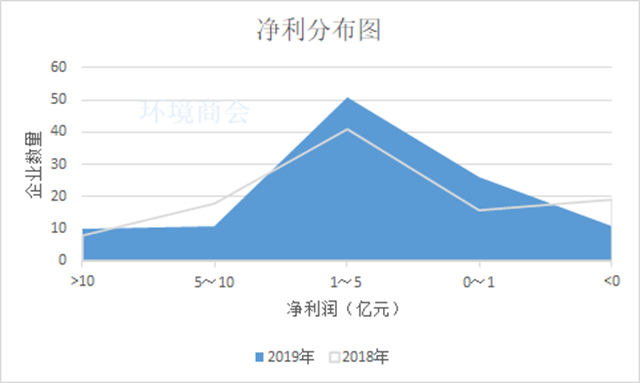 從凈利分布來看。2019年,10家企業(yè)凈利超10億,盈利水平在5億到10億之間的企業(yè)11家,這一數(shù)字較2018年減少7家。此外,近半數(shù)企業(yè)的歸母凈利集中在1億~5億之間,而盈利水平在1億以下的企業(yè)有26家,這兩部分企業(yè)數(shù)據(jù)合計達(dá)77家,較2018年增加了20家。虧損企業(yè)數(shù)量則相對減少,為11家,包括津膜科技、鐵漢生態(tài)、天翔環(huán)境、凱迪生態(tài)、盛運環(huán)保、中創(chuàng)環(huán)保等,這些企業(yè)除鐵漢生態(tài)、津膜科技外基本在2018年已經(jīng)陷入虧損狀態(tài),至今尚未扭轉(zhuǎn),虧損最為嚴(yán)重的是盛運環(huán)保,虧損額度達(dá)20億。