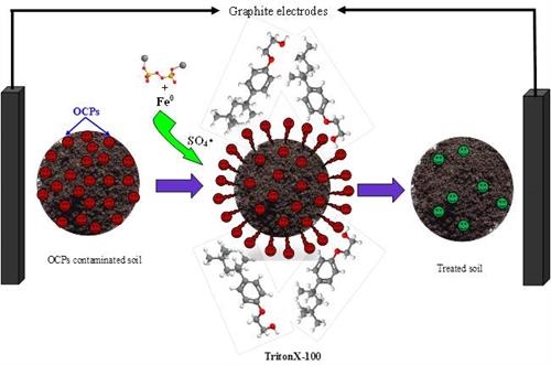 研究發(fā)現(xiàn)1:利用曲拉通X-100(TX--100)在電動條件下增加OCs的有效性,提高土壤中OCs的氧化效率。選取共溶劑TX-100和Na2S2O8為電解液,OCs的去除率在56.36%和88.05%之間。TX-100能夠顯著提高與土壤顆粒緊密結(jié)合的難溶性化合物的溶解度,同時電動修復(fù)裝置促進土壤中氧化劑和表面活性劑的遷移,促使共溶劑在土壤中傳輸和擴散,該設(shè)置能夠促進土壤中難溶性化合物和氧化劑的有效接觸,同時TX-100通過溶出土壤中金屬離子促進S2O82-活化產(chǎn)生硫酸鹽自由基和羥基自由基,從而提高土壤中OCs的降解效率。