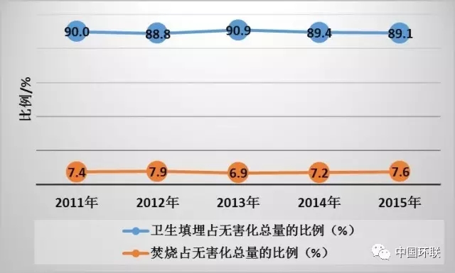 “十二五”期間縣城生活垃圾不同無(wú)害化技術(shù)處理比例,填埋比例一直穩(wěn)定在89%左右