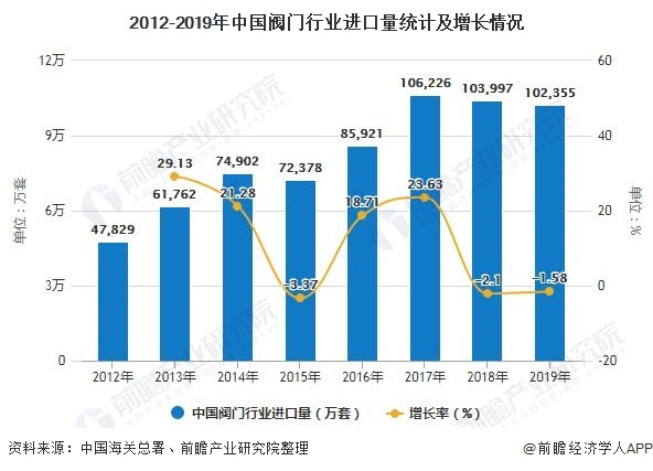 海關(guān)數(shù)據(jù)顯示,2012-2019年,我國閥門行業(yè)進口量總體呈波動上升趨勢。2018-2019年這兩年由于受到與美國的貿(mào)易摩擦影響,行業(yè)進口量和增速均下滑,2019年行業(yè)進口量為102355萬套,同比下滑1.58%。