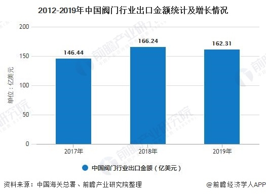 出口方面,據(jù)海關(guān)數(shù)據(jù)顯示,2017-2019年我國閥門行業(yè)出口金額呈波動上升趨勢,2018年為166.24億美元,同比增長13.5%;2019年,我閥門行業(yè)出口總額有所回落,為162.31億美元,同比下滑0.02%。