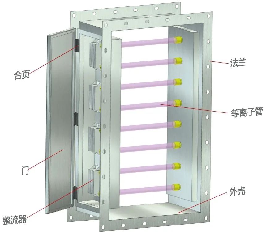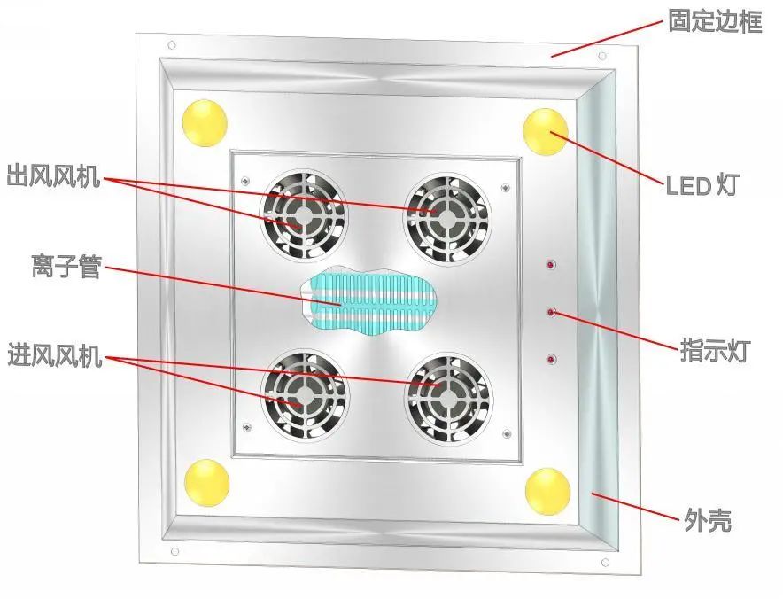 本產(chǎn)品安裝于室內(nèi)吊頂天花板上,內(nèi)部為離子管和紫外燈管雙重消毒過(guò)程,在四組節(jié)能靜音風(fēng)機(jī)作用下,通過(guò)使室內(nèi)空氣循環(huán)經(jīng)過(guò)離子與紫外過(guò)程,紫外燈用來(lái)破壞細(xì)菌病毒中的DNA(脫氧核糖核酸)或RNA(核糖核酸)的分子結(jié)構(gòu),造成生長(zhǎng)性細(xì)胞死度亡和(或)再生性細(xì)胞死亡,達(dá)到殺菌消毒的效果;離子發(fā)生器同時(shí)產(chǎn)生的正離子與負(fù)離子在空氣中進(jìn)行正負(fù)電荷中和的瞬間產(chǎn)生巨大的能量釋放,從而導(dǎo)致其周圍細(xì)菌結(jié)構(gòu)的改變或能量的轉(zhuǎn)換,從而致使細(xì)菌死亡,實(shí)現(xiàn)其殺菌的作用。由于負(fù)離子的數(shù)量大于正離子的數(shù)量,因此多余的負(fù)離子仍然飄浮在空氣中,可以達(dá)到消煙、除塵、消除異味、改善空氣的品質(zhì),以改善室內(nèi)環(huán)境。