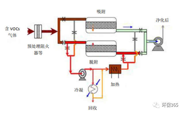 采用活性炭作為吸附劑,采用惰性氣體循環(huán)加熱脫附分流冷凝回收的工藝對有機(jī)氣體進(jìn)行凈化和回收?;厥找和ㄟ^后續(xù)的精制工藝可實現(xiàn)有機(jī)物的循環(huán)利用。工藝原理示意圖如下: