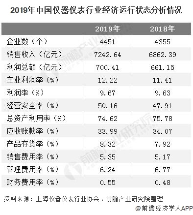 2019年儀器儀表行業(yè)除了總資產(chǎn)利用率、產(chǎn)品存貨率、銷(xiāo)售費(fèi)用率和財(cái)務(wù)費(fèi)用率四個(gè)較2018年同期有所下降外,其余指標(biāo)均實(shí)現(xiàn)了增長(zhǎng)。其中2019年儀器儀表行業(yè)實(shí)現(xiàn)銷(xiāo)售收入7242.64億元,同比增長(zhǎng)5.54%;實(shí)現(xiàn)利潤(rùn)總額700.41億元,同比增長(zhǎng)5.94%。總體來(lái)看,儀器儀表行業(yè)運(yùn)行情況較為穩(wěn)定。