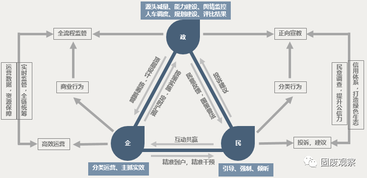 當(dāng)前,政、企、民三方各司其職,共同推進垃圾分類。政府層面聚焦頂層規(guī)劃,企業(yè)著力于高效運營,居民端發(fā)動全民參與。聯(lián)運環(huán)境從企業(yè)角度分析了在此情況下,如何在政企民協(xié)同發(fā)展中嵌入信息化系統(tǒng),打造信息化閉環(huán)。