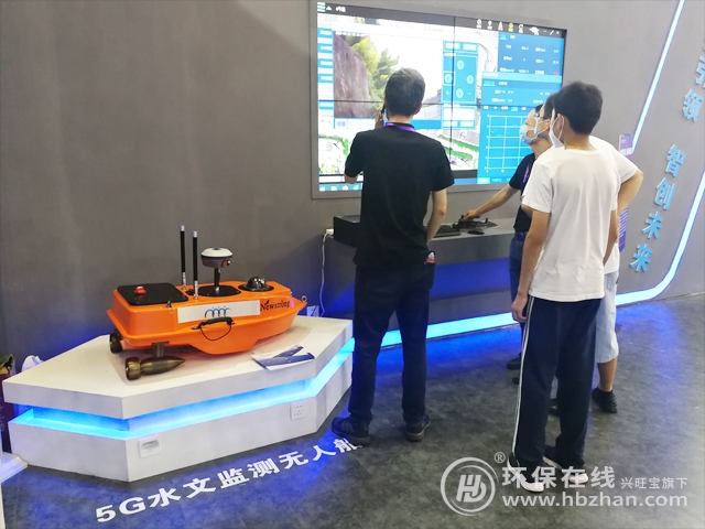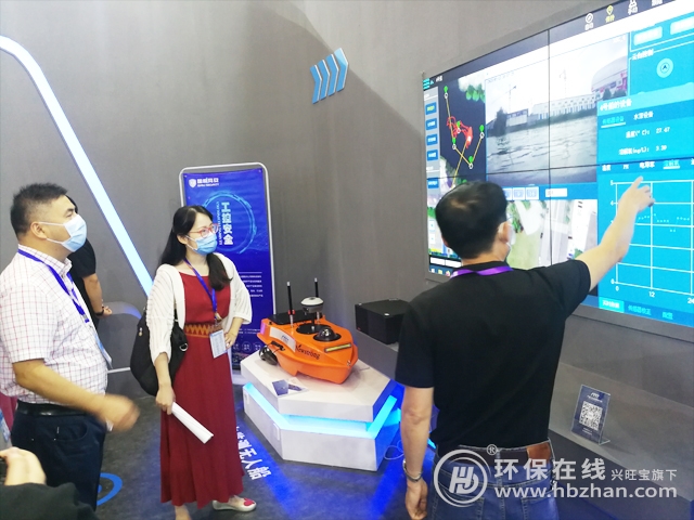 圖為展會現(xiàn)場相關(guān)工作人員介紹河湖監(jiān)管巡查無人船及水質(zhì)監(jiān)測無人船應(yīng)用平臺
