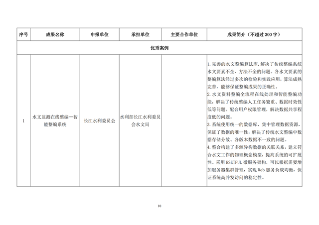 為及時(shí)總結(jié)先行先試經(jīng)驗(yàn),提煉形成可復(fù)制可推廣成果,加快推進(jìn)智慧水利,根據(jù)《水利部關(guān)于開展智慧水利先行先試工作的通知》(水信息〔2020〕46號)要求,水利部網(wǎng)信辦近期組織完成智慧水利先行先試中期檢查評估工作,同步開展了智慧水利先行先試成果申報(bào)與評選。11家先行先試單位積極響應(yīng),共申報(bào)先行先試成果49項(xiàng),經(jīng)技術(shù)指導(dǎo)人初評、征求業(yè)務(wù)司局業(yè)務(wù)指導(dǎo)人意見、責(zé)任專家審核、集中評審?fù)镀钡拳h(huán)節(jié),并經(jīng)部長專題辦公會審議,形成智慧水利先行先試成果目錄(2020年度)(共10項(xiàng)最佳實(shí)踐和8項(xiàng)優(yōu)秀案例,排名不分先后)?,F(xiàn)將成果目錄及相關(guān)信息予以公示,如有異議,請?jiān)诠酒趦?nèi)以實(shí)名書面形式反饋我辦。