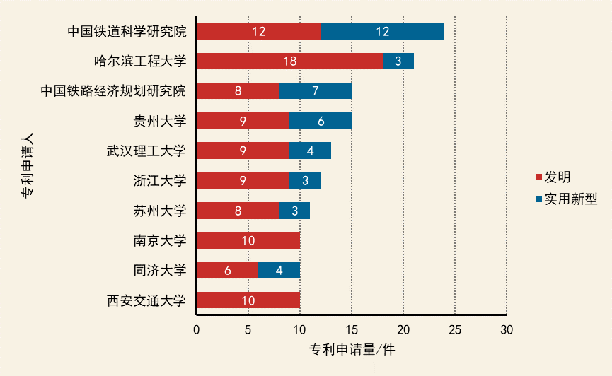 中國國內(nèi)院校在該技術(shù)領(lǐng)域的專利申請量偏少。排在前三位的高校/科研院所分別是中國鐵道科學(xué)研究院、哈爾濱工程大學(xué)、中國鐵路經(jīng)濟(jì)規(guī)劃研究院。