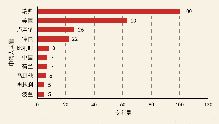 核心專利分布方面,排名前三的是瑞典、美國和盧森堡。