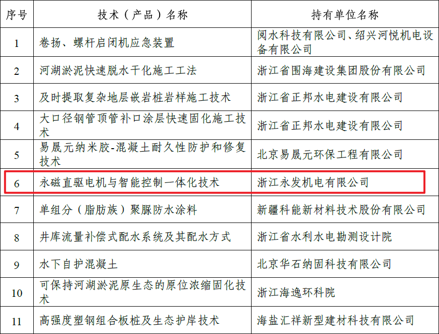 為進一步推動浙江省水利工程建設領域技術創(chuàng)新和成果轉(zhuǎn)化,提升水利工程建設的科技水平,經(jīng)征集、評審和公示等程序,結(jié)合近三批《浙江省水利新技術推廣指導目錄》,由浙江永發(fā)機電有限公司自主研發(fā)的“永磁直驅(qū)電機與智能控制一體化技術”等共28項技術(產(chǎn)品)列入2020年度浙江省水利工程建設領域新技術推廣應用清單。