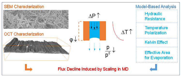 作為新型膜分離技術的代表之一,膜蒸餾在處理高濃度鹵水和苦咸水中具有獨特優(yōu)勢。然而,微溶無機鹽在膜蒸餾過程中結晶并形成結垢層是制約該技術發(fā)展的難題之一;尤其以硫酸鈣為代表的非堿性微溶鹽,目前仍缺乏有效的解決方法,其相關機理的研究對推動膜蒸餾技術的應用具有重要意義。結垢的發(fā)生不但會造成通量的下降,還會對分離膜產生不可逆的損傷。由于表征技術的相對欠缺,膜蒸餾過程中結垢現(xiàn)象發(fā)生和演化的機理仍未被充分解析。
