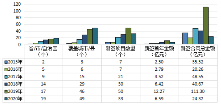 2020年,龍馬環(huán)衛(wèi)新增中標(biāo)環(huán)衛(wèi)服務(wù)項(xiàng)目 33 個(gè),新簽合同年化金額 6.59 億元,同比下降 46.29%,新簽合同總金額 24.32 億元,同比下降 78.15%。