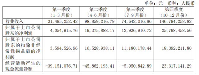 綜合分季度主要財(cái)務(wù)數(shù)據(jù)(圖2)來看,第一季度較為穩(wěn)定,收入是3149.5萬元;第二季度收入逐漸樂觀,達(dá)到了9885.9萬元;第三季度有些許下降,收入為7464.2萬元;第四季度收入明顯增長,達(dá)到了1.47億元,且凈利潤和現(xiàn)金流動(dòng)凈額都有大幅的增長。
