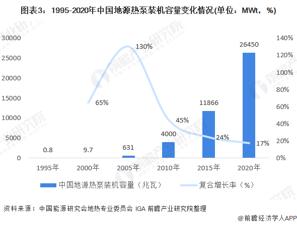 從我國地源熱泵裝機容量規(guī)模來看,根據(jù)中國能源研究會地熱專業(yè)委員會數(shù)據(jù),過去20多年,中國地源熱泵呈現(xiàn)高速發(fā)展態(tài)勢。1995年全國地源熱泵的裝機容量僅為0.8兆瓦(熱功率),2010年已達4千多兆瓦,2000-2005年復合增長率高達130%;