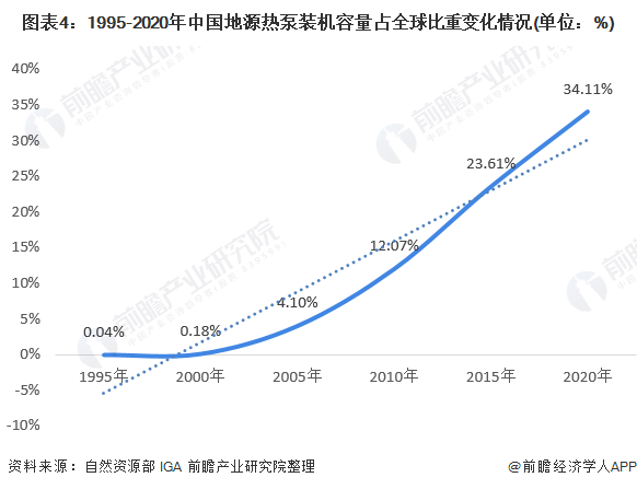 從裝機容量占全球總量的比重看,國內(nèi)地源熱泵裝機容量占比已從1995年的0.04%上升到2015年的23.61%,2020年國內(nèi)地源熱泵裝機容量占全球的比重上升到34.11%,且增長速度持續(xù)加快。