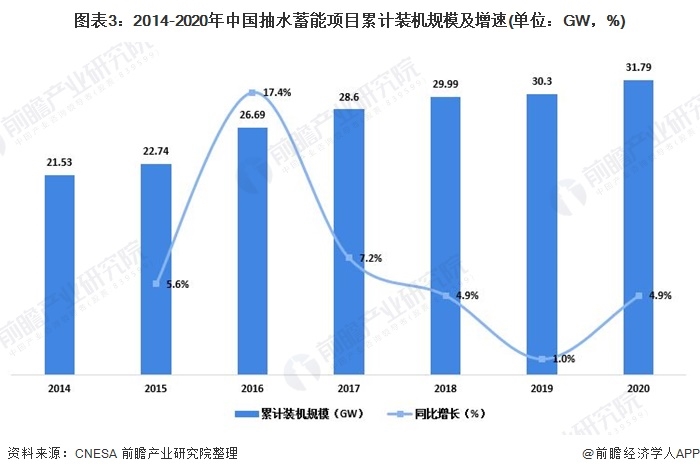 截至2020年底,我國(guó)抽水蓄能的累計(jì)裝機(jī)規(guī)模達(dá)到31.79GW,同比增長(zhǎng)4.9%。因抽水蓄能相對(duì)其他儲(chǔ)能方式成本較低,短期看來(lái),其在儲(chǔ)能應(yīng)用中的主導(dǎo)地位不會(huì)被動(dòng)搖。