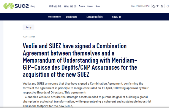 4月12日,事件出現(xiàn)了重要轉(zhuǎn)折——威立雅和蘇伊士宣布,昨晚各自的董事會原則上就兩集團合并的主要條款和條件達成協(xié)議。兩家公司以每股Suez股份20.50歐元的價格(附息票)為條件達成協(xié)議,該交易的銷售額約為370億歐元。
