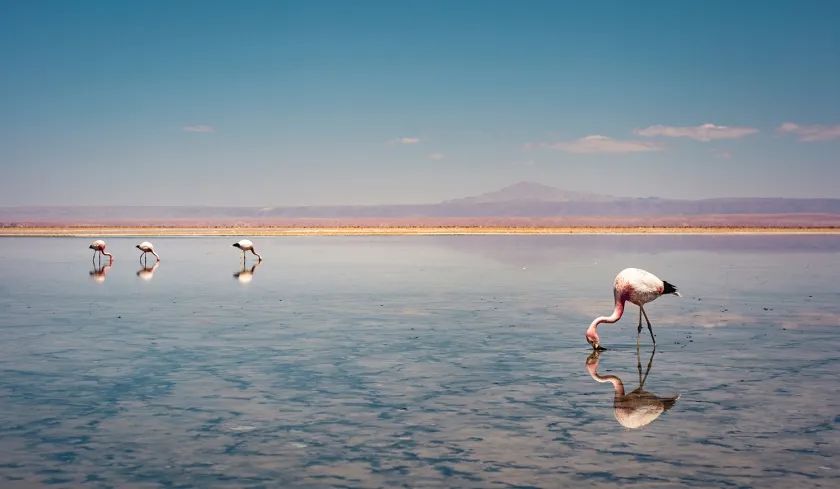 火烈鳥佇立在智利湖中。