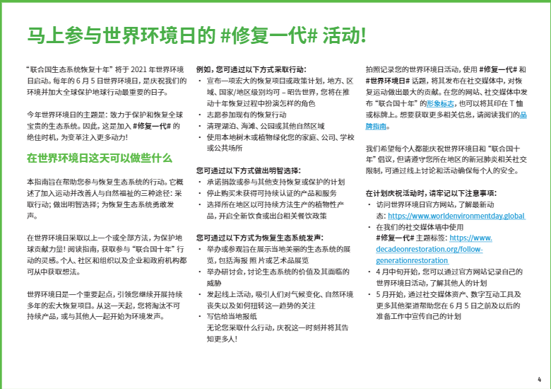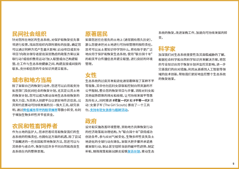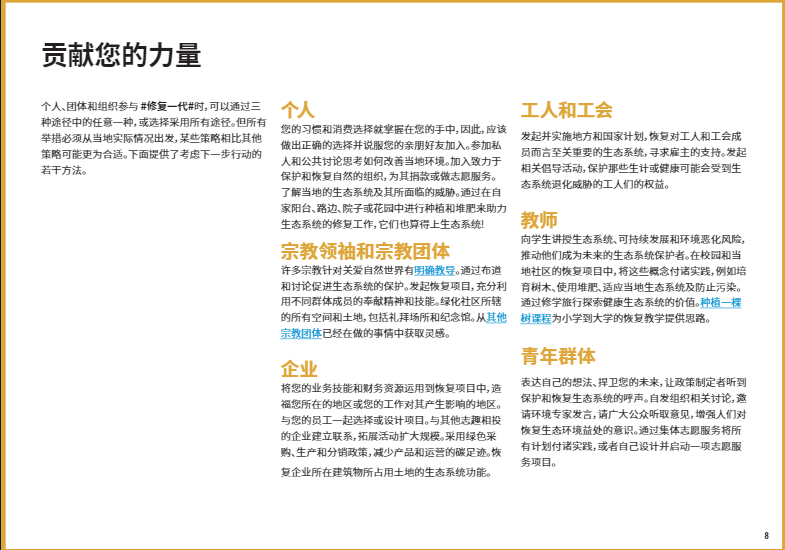在本文中,我們將重點介紹八個關(guān)鍵的生態(tài)系統(tǒng)類型,以及如何開展修復工作使它們恢復活力。如果你有志于加入#修復一代,#RestorationGeneration,想深入了解改善本地生態(tài)系統(tǒng)的方法,歡迎大家下載閱讀由”聯(lián)合國十年”倡議發(fā)布的《生態(tài)系統(tǒng)修復手冊》,一本有關(guān)治愈地球的實用指南??
