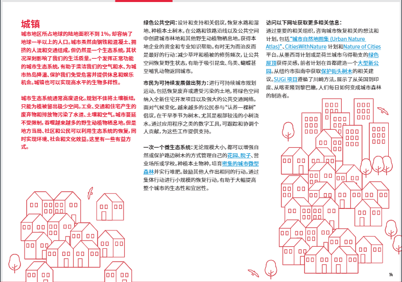城鎮(zhèn)看起來就像是生態(tài)沙漠。房屋、道路和工廠之間幾乎沒有植被生長的空間。廢棄物和污染破壞水道、土壤和空氣。但是城市具有巨大的恢復潛力。公民團體和市政當局可以清理水道;種植吸引蜜蜂的植物;并在公園、學校和其他公共場所創(chuàng)造城市林地和其他野生動植物棲息地。減少割草的頻率不僅能節(jié)約城市的開支,并且可以使自然蓬勃發(fā)展。透水性人行道以及城市濕地可防止洪水和污染。改造受污染的工業(yè)區(qū),使之變身成為自然和娛樂場所。你知道嗎? 如今在紐約的中央公園,載有記錄的鳥類高達280多種。在聯(lián)合國環(huán)境規(guī)劃署和聯(lián)合國糧食及農(nóng)業(yè)組織的領(lǐng)導下,“聯(lián)合國生態(tài)系統(tǒng)恢復十年”倡議將匯集全球的政治支持、科學研究和財政力量,開展大規(guī)模的生態(tài)修復工作,致力于恢復數(shù)百萬公頃的陸地和水生生態(tài)系統(tǒng)。