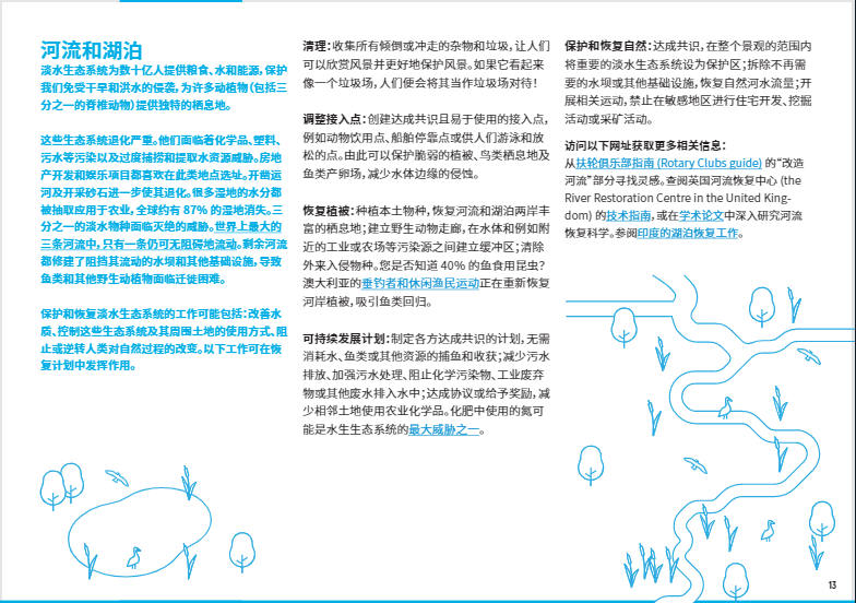 安全且充足的水源已成為一種奢侈品。污染、過度捕撈、基礎(chǔ)設(shè)施建設(shè)以及因灌溉、工業(yè)和家庭用水增加而對水資源無休止的攫取正導致淡水生態(tài)系統(tǒng)不斷退化。恢復意味著減輕污染、減少并有效處理廢棄物、對水源和魚類資源的開采進行可持續(xù)管理以及恢復地表和地下的植被。