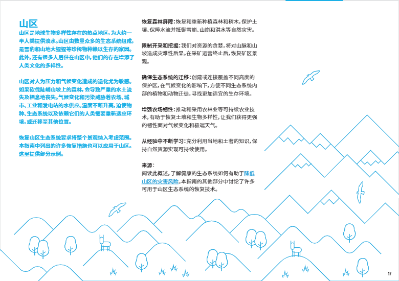 在山區(qū),清除坡地植被改種農(nóng)作物或修建房屋,會引發(fā)水土流失,并從源頭污染河流。全球溫度的飆升迫使物種、生態(tài)系統(tǒng)和人類被動適應(yīng)或被迫遷徙。要想應(yīng)對這一趨勢,人類需通過恢復森林以及加強對于山地生態(tài)系統(tǒng)的保護以對抗雪崩、山體滑坡和洪水。政府官員可以規(guī)劃水壩和道路,避免導致河流和其他棲息地碎片化。面對氣候變化的影響,農(nóng)林業(yè)等農(nóng)業(yè)技術(shù)可能更具韌性。