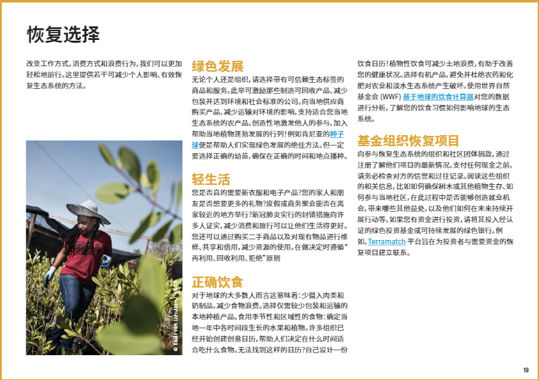 人們砍伐并清空森林和樹木,將林地轉(zhuǎn)化為耕地、牧場、城市等用地以滿足人類對土地和資源的渴求。伐木、劈柴、污染、有害物種入侵和野火正在摧毀所剩不多的林地。恢復森林生態(tài)系統(tǒng)意味著大規(guī)模植樹造林并減輕森林的壓力,使樹木恢復自然生長。糧食系統(tǒng)是森林流失的一大主要驅(qū)動因素。重新考慮我們?nèi)绾畏N植及消費糧食,有助于減輕森林與日俱增的壓力。因土壤的退化而遭廢棄的農(nóng)田可能是恢復森林的理想之地,這也意味著繁忙的農(nóng)場和村莊周邊蘊藏著培育成片森林和林地的機會。
