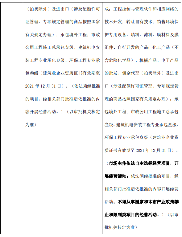 變更后公司經(jīng)營范圍為:環(huán)境保護設(shè)施運營;環(huán)境保護技術(shù)、水處理及污水處理技術(shù)、苦咸水及海水淡化技術(shù)、水及水中價值物再生回用和資源化技術(shù)、環(huán)保節(jié)能技術(shù)、生態(tài)修復技術(shù)、物聯(lián)網(wǎng)、大數(shù)據(jù)、云計算的技術(shù)開發(fā)、技術(shù)推廣、技術(shù)轉(zhuǎn)讓、技術(shù)咨詢、技術(shù)服務(wù);信息系統(tǒng)集成服務(wù);通訊設(shè)備銷售;計算機、軟件及輔助設(shè)備批發(fā);地理遙感信息服務(wù);軟件銷售;技術(shù)推廣服務(wù);基礎(chǔ)軟件服務(wù),應(yīng)用軟件服務(wù)(不含醫(yī)用軟件)、軟件開發(fā);機電設(shè)備安裝;工程工藝設(shè)計;建設(shè)工程項目管理;計算機系統(tǒng)集成;工程控制與管理軟件和相應(yīng)網(wǎng)絡(luò)的技術(shù)開發(fā);轉(zhuǎn)讓自有技術(shù);銷售環(huán)境保護專用設(shè)備、填料、濾料、膜材料及膜組件、自行開發(fā)的產(chǎn)品;化工產(chǎn)品(不含危險化學品)、機械產(chǎn)品、電子產(chǎn)品的批發(fā)、傭金代理(拍賣除外)及進出口(涉及配額許可證管理、專項規(guī)定管理的商品按照國家有關(guān)規(guī)定辦理);承包境外工程;市政公用工程施工總承包叁級、建筑機電安裝工程專業(yè)承包叁級、環(huán)保工程專業(yè)承包叁級(建筑業(yè)企業(yè)資質(zhì)證書有效期至 2021 年 12 月 31 日)。(市場主體依法自主選擇經(jīng)營項目,開展經(jīng)營活動;依法須經(jīng)批準的項目,經(jīng)相關(guān)部門批準后依批準的內(nèi)容開展經(jīng)營活動;不得從事國家和本市產(chǎn)業(yè)政策禁止和限制類項目的經(jīng)營活動。)