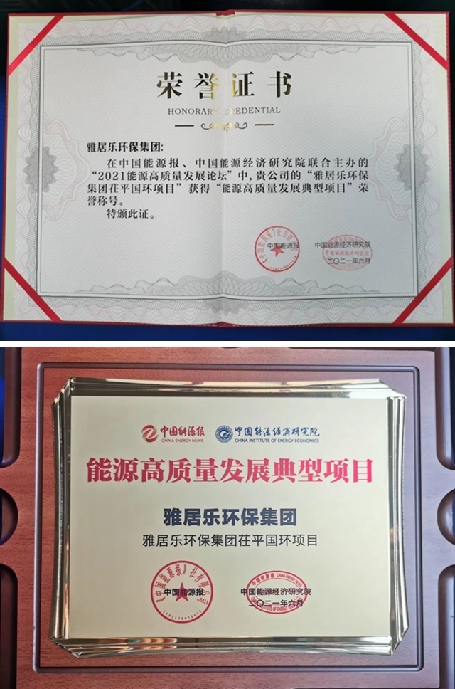 ▲雅居樂環(huán)保集團獲獎證書及獎牌