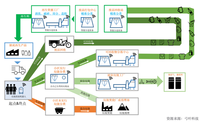 以弓葉科技為例,其將Ai和固廢大數(shù)據(jù)相結(jié)合,實現(xiàn)固體廢棄物的精準(zhǔn)分類。目前,越來越多的再生資源回收企業(yè)正在積極建設(shè)數(shù)字化、智能化、自動化的可回收物分揀中心,通過引進人工智能垃圾分揀機器人代替人工,提高可回收物精細化分選效率。例如,北京愛分類和弓葉科技合作建設(shè)的可回收垃圾智能分揀中心、上海城投和弓葉科技合作建設(shè)的可回收垃圾智能分揀中心,均在此列。