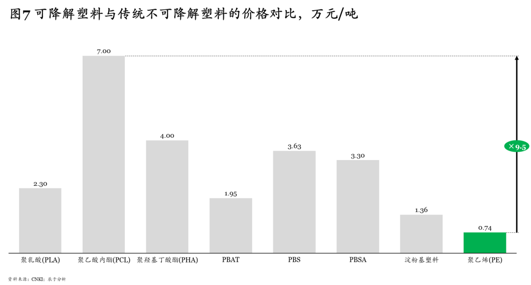 不可降解塑料如PP、PET、 PE等價格較低,可降解塑料價格明顯高于它們,目前主流可降解塑料如PLA、PHA、 PBAT的價格分別在1.6-3萬元/噸、4萬元/噸、1.4-2.5萬元/噸左右,是PE價格的2~5倍, 而PCL 的價格甚至高達7萬元/噸,是PE價格的9.5倍(見圖7)。