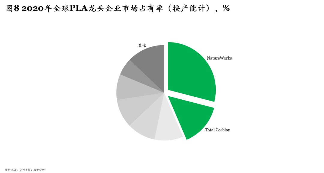 原料價格高、技術(shù)水平較低、產(chǎn)能利用率較低,是導(dǎo)致我國可降解塑料價格居高不下的三大主因。以PLA為例,一步法雖然成本低但品質(zhì)差,二步法品質(zhì)優(yōu),是目前主流合成路線,但成本高,是一步法的2.3倍左右。如何實現(xiàn)高純度、低成本是提升滲透率、贏得市場競爭的關(guān)鍵:例如美國NatureWorks、法國 Total 和荷蘭 Corbion 的合建公司Total Corbion由于擁有PLA制備中間體—丙交酯的低成本高純度制備工藝而引領(lǐng)全球市場,2020年的產(chǎn)能占有率分別達到29.04%和14.52%(圖8)。