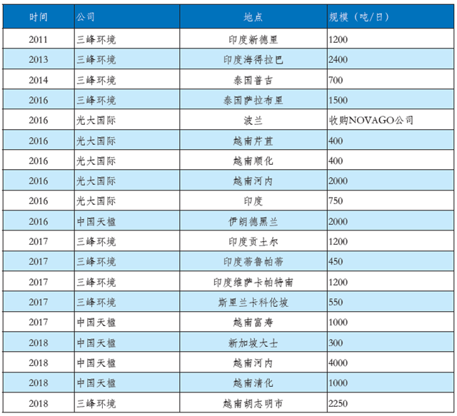 在固廢領(lǐng)域,具備自主設(shè)備制造能力的三峰環(huán)境、光大國際、中國天楹等企業(yè)也已經(jīng)成功邁出國際化的堅實一步。以三峰環(huán)境為例,2013年投資并運營多座生活垃圾填埋場、危險廢物處理廠、垃圾資源化回收利用廠以及生活垃圾發(fā)電廠。同年,隆企集團贏得印度首批垃圾發(fā)電項目,確定與三峰環(huán)境合作,并采用三峰環(huán)境提供的設(shè)備和技術(shù)方案。目前三峰環(huán)境的技術(shù)設(shè)備已應(yīng)用到美國、印度、埃塞俄比亞、泰國、斯里蘭卡、越南、巴西等七個國家的垃圾焚燒發(fā)電項目。