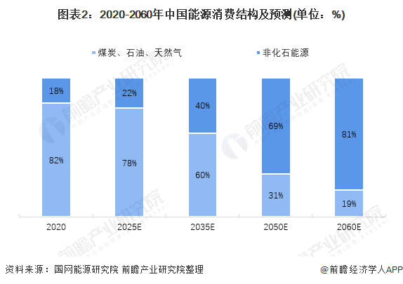 據(jù)國(guó)網(wǎng)能源研究院預(yù)測(cè),至2035年,我國(guó)化石能源消費(fèi)量占比將下降至60%;至2060年,化石能源消費(fèi)量占比將下降至19%。而以新能源及可再生能源為主的非化石能源消耗比重將從2020年的18%提升至2060年的81%。