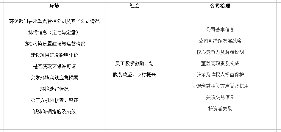 隨著可持續(xù)發(fā)展理念在國內(nèi)的逐步推進,2021年6月證監(jiān)會發(fā)布了《公開發(fā)行證券的公司信息披露內(nèi)容與格式準(zhǔn)則第2號—年度報告的內(nèi)容與格式(2021年修訂)》(以下簡稱《年報格式準(zhǔn)則(2021修訂)》)和《公開發(fā)行證券的公司信息披露內(nèi)容與格式準(zhǔn)則第3號—半年度報告的內(nèi)容與格式(2021年修訂)》(以下簡稱《半年報格式準(zhǔn)則(2021修訂)》)。相較于證監(jiān)會2017年發(fā)布的年報格式準(zhǔn)則,《年報格式準(zhǔn)則(2021修訂)》進一步明確了上市企業(yè)ESG信息披露標(biāo)準(zhǔn)和格式。從環(huán)境層面,《年報格式準(zhǔn)則(2021修訂)》不僅要求企業(yè)定性、定量的對排污信息進行披露,還要求企業(yè)披露報告期內(nèi)因環(huán)境問題受到的行政處罰情況。此外,還鼓勵企業(yè)披露所采取的減少碳排放措施及減排效果,引導(dǎo)企業(yè)提高對環(huán)境保護及減排降碳的關(guān)注度。從社會層面,《年報格式準(zhǔn)則(2021修訂)》綜合我國目前經(jīng)濟發(fā)展?fàn)顩r,對信息披露要求進行更新,比如將原本要求披露的“履行扶貧社會責(zé)任的情況”變更為“鞏固脫貧攻堅、鄉(xiāng)村振興等工作情況”。從公司治理層面,《年報格式準(zhǔn)則(2021修訂)》提出了公司關(guān)鍵利益相關(guān)方的信譽及信用管理,完善企業(yè)內(nèi)部多維度監(jiān)管和定期審核評估,強化了企業(yè)對投資者的管理。