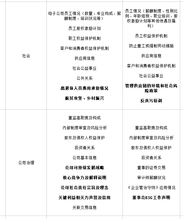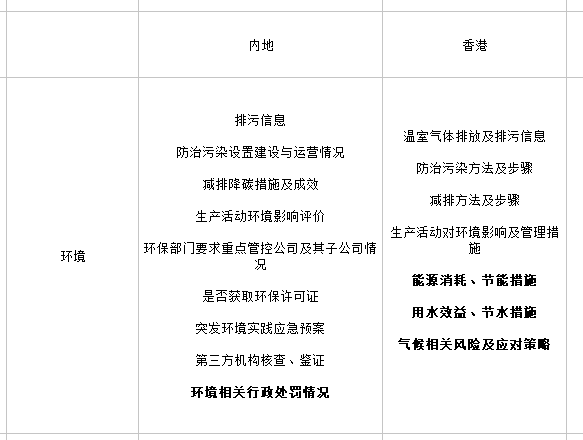 環(huán)境層面而言,內(nèi)地證監(jiān)會發(fā)布的企業(yè)年報、半年報格式準(zhǔn)則和港交所發(fā)布的《ESG指引》中都對企業(yè)排污狀況及減排措施和成果的信息披露提出要求。港交所發(fā)布的《ESG指引》中還要求上市企業(yè)能源消耗、用水效益進行披露,同時企業(yè)也被要求披露節(jié)能節(jié)水措施?!禘SG指引》中還強調(diào)了企業(yè)需要提高對氣候變化相關(guān)風(fēng)險的關(guān)注度,內(nèi)地上市企業(yè)則被要求在年報和半年報中公布因環(huán)境問題受到的行政處罰情況。社會層面,兩地上市企業(yè)有關(guān)ESG的信息披露要求中所涉及的指標(biāo)總體上較為相似。港交所發(fā)布的《ESG指引》中強調(diào)了企業(yè)要對供應(yīng)鏈的可持續(xù)發(fā)展能力加大關(guān)注力度,同時也要求企業(yè)公布對董事和員工的反貪腐培訓(xùn)情況。內(nèi)地證監(jiān)會則結(jié)合了內(nèi)地經(jīng)濟發(fā)展?fàn)顩r和政策形勢,要求企業(yè)披露鄉(xiāng)村振興和脫貧攻堅工作進展。公司治理層面,兩地都對董事會推動企業(yè)內(nèi)部ESG工作作出要求。兩地的要求中都提及了企業(yè)需要對董監(jiān)高構(gòu)成及職責(zé)進行說明,同時也要求上市企業(yè)披露有關(guān)內(nèi)部管理制度、風(fēng)險管理狀況及股東和債權(quán)人權(quán)益保護的信息?!禘SG指引》中特別要求了董事會必須發(fā)布有關(guān)ESG相關(guān)工作參與情況的聲明,以此督促董事會對ESG工作的實質(zhì)性參與。內(nèi)地現(xiàn)行的上市企業(yè)年報、半年報格式準(zhǔn)則中則要求企業(yè)在“公司治理”板塊中對公司社會責(zé)任宗旨及理念、可持續(xù)發(fā)展戰(zhàn)略以及核心競爭力進行說明。