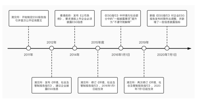 香港聯(lián)合交易所(以下簡稱“港交所”)相較于內(nèi)地兩家交易所更早的地對上市企業(yè)ESG信息披露作出強制性要求。2011年港交所就開始了對ESG信息披露的實踐探索,開始制定ESG報告指引并首次公開征詢意見。次年,港交所便發(fā)布了《環(huán)境、社會及管治報告指引》(以下簡稱《ESG指引》),建議企業(yè)披露ESG相關(guān)信息。2014年,香港特區(qū)政府發(fā)布《公司條例》,要求港股上市企業(yè)必須進行ESG信息披露。港交所先后在2015年和2019年對《ESG指引》進行修訂,2019年底修訂的最新版指引中首先對企業(yè)ESG報告發(fā)布時間進行調(diào)整,規(guī)定企業(yè)必須在財年結(jié)束后5個月內(nèi)發(fā)布ESG報告,提升了ESG信息的時效性。同時新版指引還鼓勵報告發(fā)行人尋求第三方機構(gòu)進行鑒證,以加強報告信息的可信性。