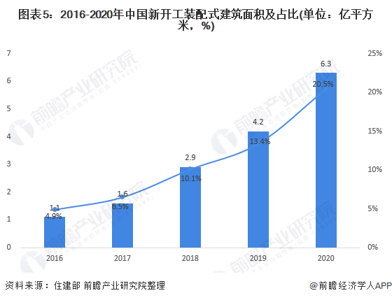 隨著各地積極推進裝配式建筑項目落地,我國新建裝配式建筑規(guī)模不斷壯大。截至2020年末,全國31個省、自治區(qū)、直轄市和新疆生產(chǎn)建設(shè)兵團新開工裝配式建筑共計6.3億平方米,較2019年增長50%,占新建建筑面積的比例約為20.5%。