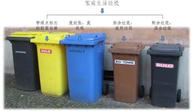 德國生活垃圾分類多采用“五分法”,即將生活垃圾分為以下五大類分別扔入不同顏色垃圾桶:棕色桶裝有機(jī)垃圾(包括剩飯剩菜、果皮骨頭等廚余垃圾,庭院綠化垃圾);黃色桶(或袋)裝輕型包裝(如塑料袋,包裝盒,牛奶盒等);藍(lán)色桶收集廢紙與廢紙箱;廢玻璃經(jīng)過分類后分別投入棕色、白色、綠色三種顏色的垃圾桶;剩余黑色或灰色的桶,用來收集所有居民分到無法再分的剩余垃圾。
