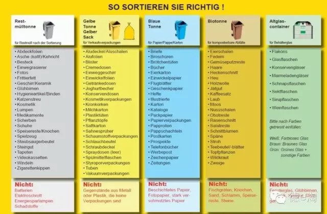 此外,居民需要把大件垃圾、有毒有害垃圾或電子廢棄物投放到專門的回收站內(nèi)。裝修垃圾需要預(yù)定一個(gè)大型垃圾箱,居民可以自己送到垃圾處理中心,但一般由于過重過大會(huì)叫上門收取服務(wù),垃圾按重量計(jì)算。舊衣物垃圾可以放進(jìn)居民區(qū)附近的紅十字會(huì)設(shè)立的專門收取舊衣物的箱子。舊家具家電則可以放在家門口,讓需要的人拿走,也會(huì)有專門的人來收取舊家電。在德國,垃圾分類是每個(gè)公民的義務(wù),如果分類不到位,將受到高額罰款,且個(gè)人的社會(huì)信譽(yù)也會(huì)受到影響。為了讓居民熟悉垃圾的分類原則,很多城市都印發(fā)了專門的《垃圾分類說明》。在每年年初,政府都會(huì)將新的《垃圾分類說明》和《垃圾清運(yùn)時(shí)間表》挨家挨戶投到各家郵箱,上邊有該家庭所屬的街道的名稱還有每周固定時(shí)間清理何種垃圾的信息,然后在指定日期前一天把某種固定的垃圾桶或垃圾袋放到街上等待收運(yùn)。政府也采取了一系列措施來監(jiān)管公民的垃圾行為(這部分內(nèi)容來源于網(wǎng)絡(luò))。