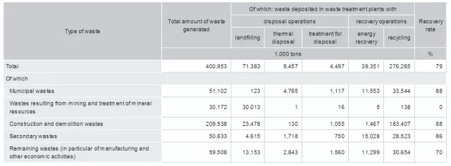 按照產(chǎn)生來源,德國的城市生活垃圾(MSW)主要分為家庭垃圾和其他垃圾兩大類。家庭垃圾包括普通家庭生活垃圾、公共垃圾、大件垃圾(廢舊家具、家電等)、有機(jī)垃圾、可回收利用的垃圾(玻璃、廢紙、紙板、塑料、輕質(zhì)包裝材料、金屬等);其他垃圾包括街道清掃垃圾、菜場垃圾、其他混合生活垃圾等。