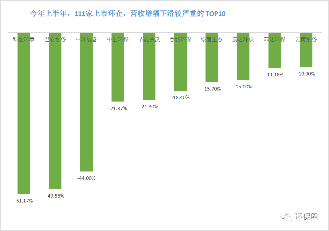 相反,同樣也有表現(xiàn)欠佳,未能在后疫情時(shí)代實(shí)現(xiàn)“業(yè)績翻盤”的營收增幅倒數(shù)TOP10企業(yè),這些企業(yè)有的是已經(jīng)引入國資,但混改成效不大,如雄安入主的科融環(huán)境,中節(jié)能旗下的中環(huán)裝備、節(jié)能鐵漢,濰坊國資接盤的巴安水務(wù);有的是營收和凈利潤財(cái)務(wù)指標(biāo)均下滑的的中創(chuàng)環(huán)保(曾用名三維絲)、惠城環(huán)保、綠茵生態(tài);還有的是營收下滑,凈利潤卻大增300.04%的菲達(dá)環(huán)保。(如圖七所示)圖七:半年度營收下滑較快的TOP10榜單▼