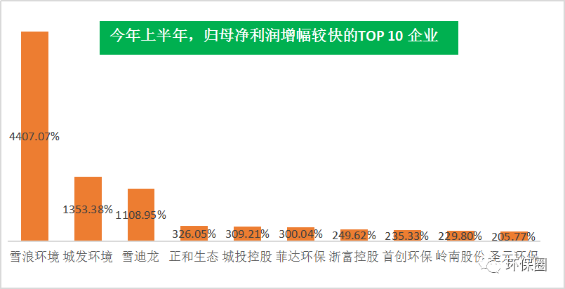 營收變動(dòng)幅度方面,數(shù)據(jù)同樣喜人。111家上市環(huán)企,除了那些穩(wěn)步連續(xù)增長“卓越者”,每年總有一些讓人意想不到的“黑馬”企業(yè)率先突圍出來,少則百分之幾百增長,多則百分之上千增長,成為上半年?duì)I收增速最快的10家先鋒企業(yè)。在半年度營收增速TOP10中,既有坐落于上海的房產(chǎn)/水務(wù)/固廢“三劍齊發(fā)”的城投控股以及旗下的上海環(huán)境,也有因納入電價(jià)補(bǔ)貼、部分焚燒項(xiàng)目轉(zhuǎn)運(yùn)營推動(dòng)業(yè)績大增的城發(fā)環(huán)境和圣元環(huán)保,亦有去年業(yè)績還萎靡不振的萬邦達(dá)和東方園林(如圖六所示)。圖六:半年度營收增速較快的TOP10榜單▼