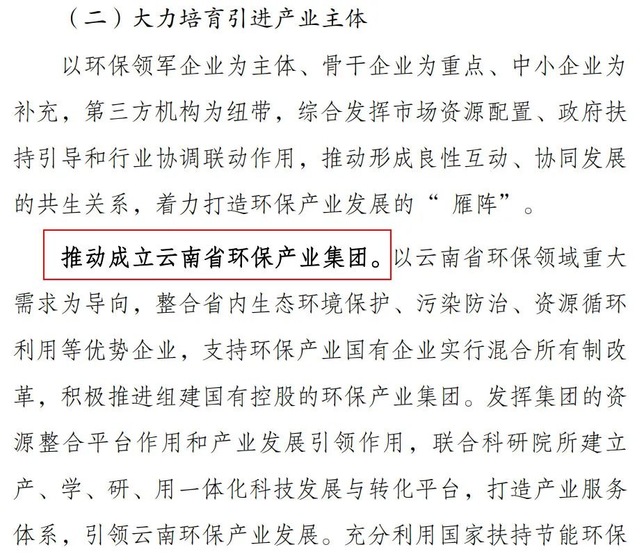 不過,這個(gè)“福建省生態(tài)環(huán)保集團(tuán)”到底什么時(shí)候組建完成,其中都包括什么內(nèi)容,一切具體的信息就都不知道了。還有云南,今年7月,云南省發(fā)布《云南省“十四五”環(huán)保產(chǎn)業(yè)發(fā)展規(guī)劃(征求意見稿)》,其中提到,要推動成立云南省環(huán)保產(chǎn)業(yè)集團(tuán)。以云南省環(huán)保領(lǐng)域重大需求為導(dǎo)向,整合省內(nèi)生態(tài)環(huán)境保護(hù)、污染防治、資源循環(huán)利用等優(yōu)勢企業(yè),支持環(huán)保產(chǎn)業(yè)國有企業(yè)實(shí)行混合所有制改革,積極推進(jìn)組建國有控股的環(huán)保產(chǎn)業(yè)集團(tuán)。