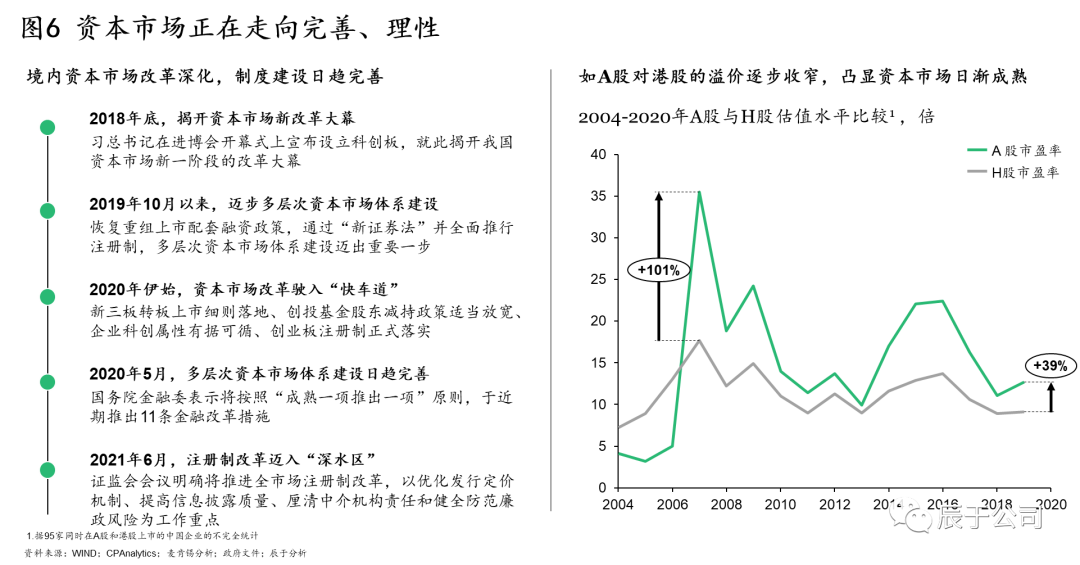 政策推動下,國內資本市場改革逐步深化,制度建設日趨完善,生態(tài)環(huán)保企業(yè)面臨的資本市場大環(huán)境正走向理性。A股對H股的溢價逐步收窄便是其中一佐證:基于對95家同時在A股和港股上市的企業(yè)的分析,可以看到相比于2006年最高峰時A股對H股超過100%的溢價,當前30%-40%的溢價已有明顯收窄(見圖6)。