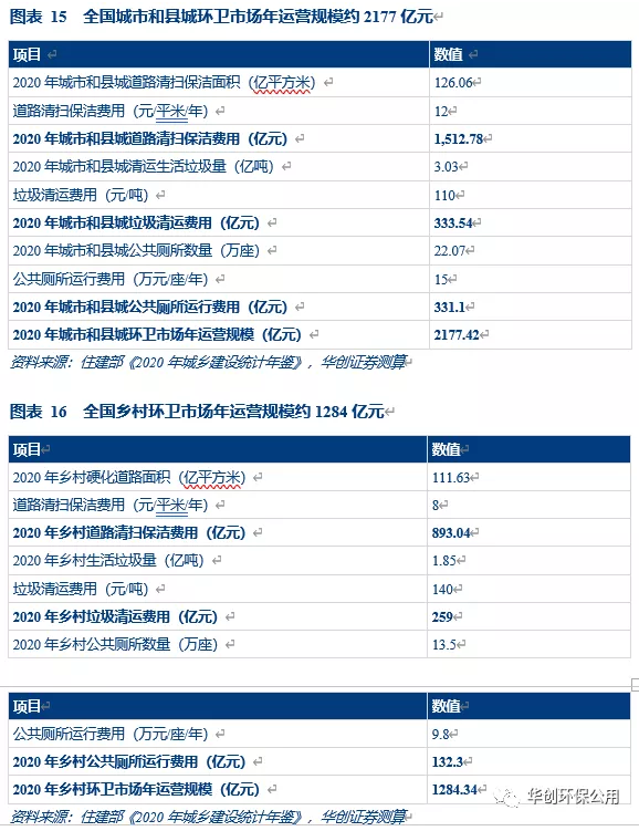 根據(jù)2020年中國城鄉(xiāng)建設(shè)統(tǒng)計年鑒,全國城市和縣城道路清掃保潔面積將達126.06億平方米,生活垃圾清運量約3.03億噸,公共廁所數(shù)量將達22.07萬座。將經(jīng)典環(huán)衛(wèi)項目的費用代入數(shù)據(jù)中,我們測算出全國城市和縣城環(huán)衛(wèi)市場年運營規(guī)模約為2177.42億元。全國鄉(xiāng)村道路清掃保潔面積將達91.24億平方米,生活垃圾清運量約1.85億噸,公共廁所數(shù)量將達12.95萬座。同樣將以前經(jīng)典環(huán)衛(wèi)項目的費用代入數(shù)據(jù)中,我們測算出全國鄉(xiāng)村環(huán)衛(wèi)市場年運營規(guī)模約為1284.34億元。加上此次垃圾分類帶來的空間提升,當前環(huán)衛(wèi)市場規(guī)模約為3800億。