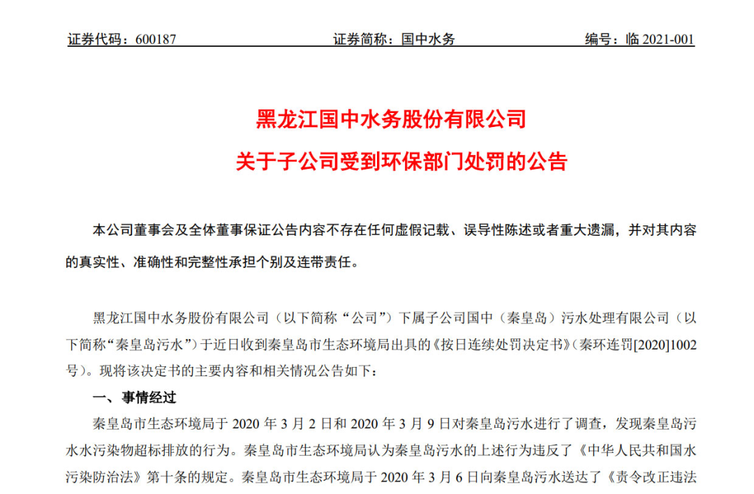 11月25日,國中水務(600187.SH)發(fā)布公告稱,其下屬子公司榮縣國中水務有限公司(下稱“榮縣國中水務”)因為“進水超標導致的出水超標及執(zhí)行標準認定問題”,被罰共計85.70萬元。