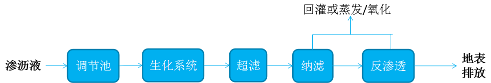 為響應(yīng)《生活垃圾填埋場(chǎng)污染控制標(biāo)準(zhǔn)》(GB 16889-2008)中垃圾滲濾液污染物排放限值的相關(guān)要求,按照《生活垃圾填埋場(chǎng)滲濾液處理工程技術(shù)規(guī)范(試行)》(HJ 564-2010)和《生活垃圾滲瀝液處理技術(shù)規(guī)范》(CJJ 150-2010),目前預(yù)處理+生物處理+膜處理的處理工藝(見(jiàn)圖3)是我國(guó)滲濾液處理的主流組合工藝。